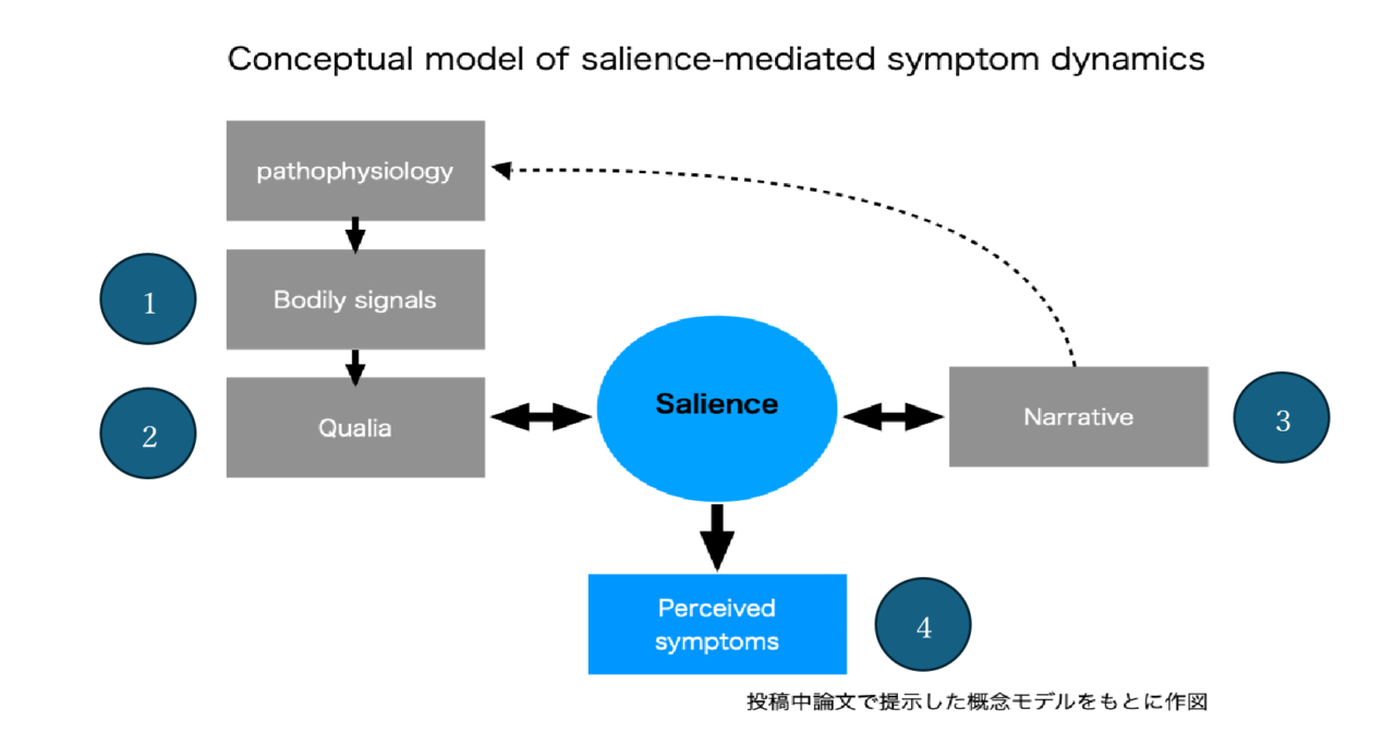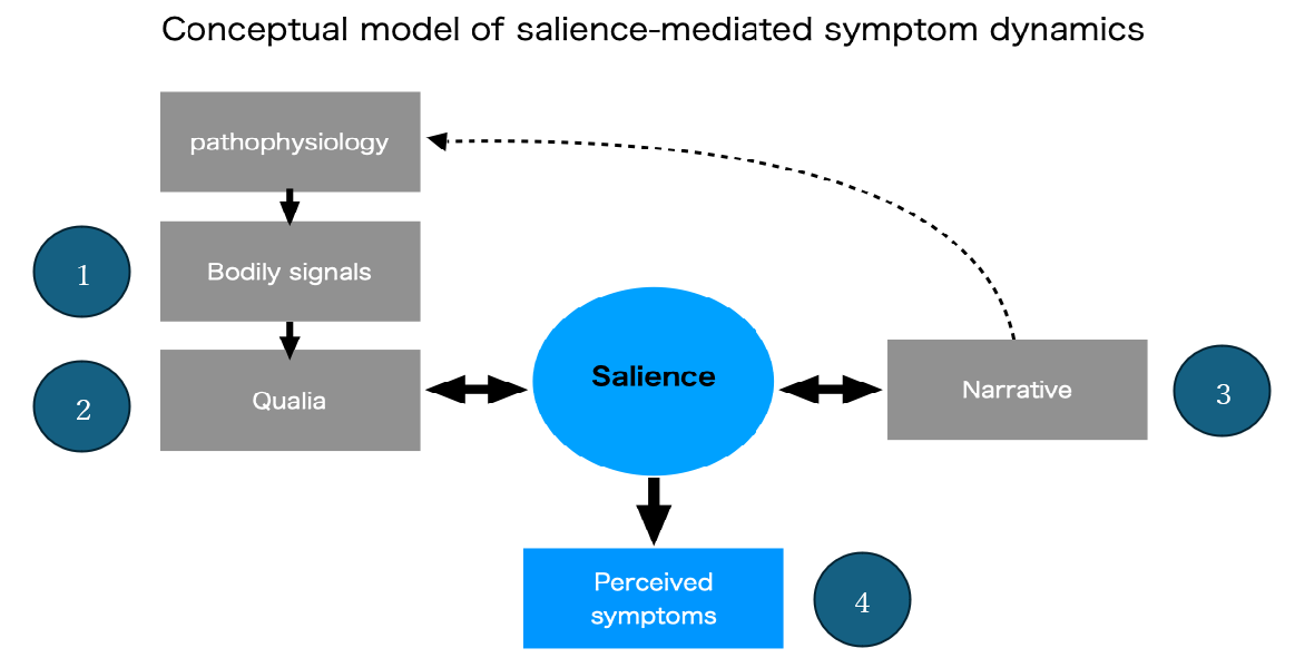 In essence: (1) signals arising from the body (pathophysiology) are sensed as (2) qualia; yet these do not appear directly as symptoms. Instead, through the regulatory function of (3) salience, they are weighted in relation to the person’s narrative—its values and emotions—and thus (4) emerge as perceived symptoms. Moreover, as bodily signals and narrative context change, this weighting is dynamically recalibrated, and symptoms fluctuate. The very attention given to symptoms shifts.